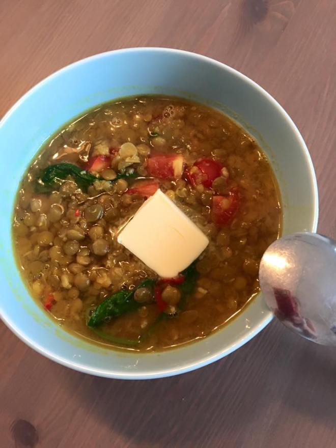 Once you graduate from this dahl you can start using more grownup lentils and spices if you like 🙂 The one pictured has baby spinach and the lentils are brown and red mix. YUM!